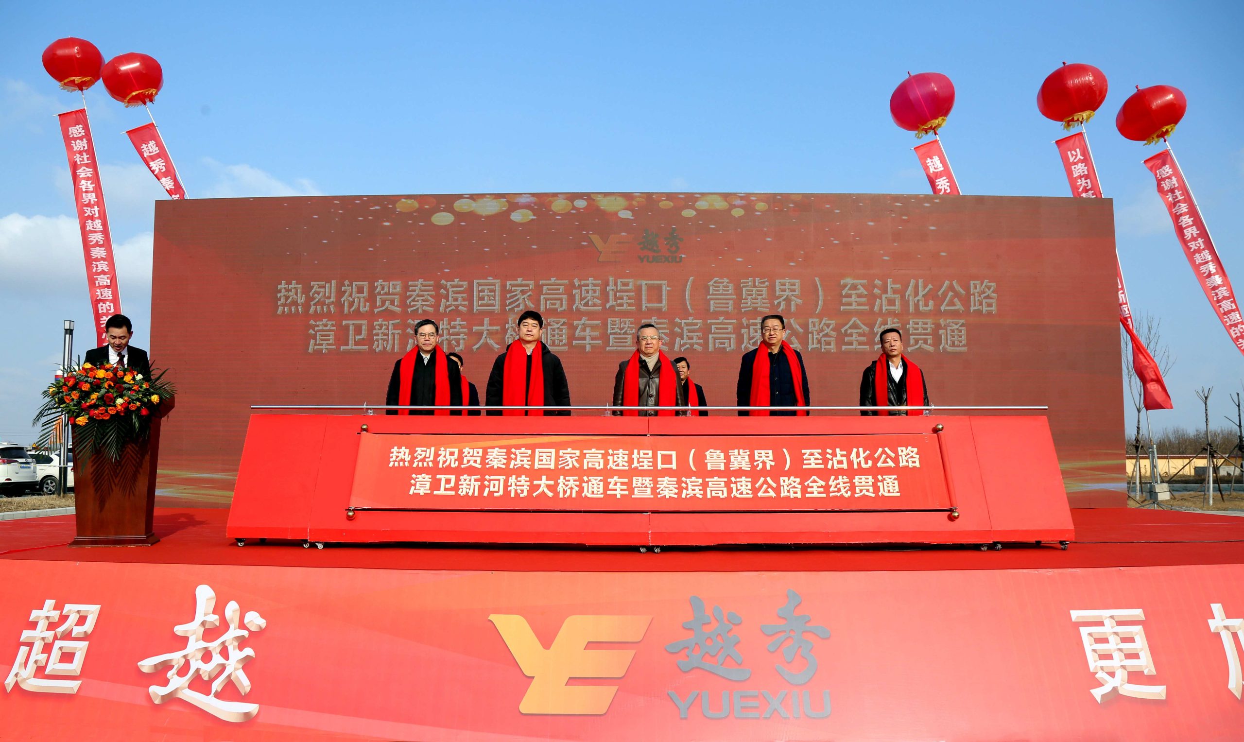 李锋董事长与参加仪式的领导共同按下启动杆,宣布越秀秦滨高速埕口(鲁冀界)至沾化公路漳卫新河特大桥正式通车,秦滨高速全线贯通。